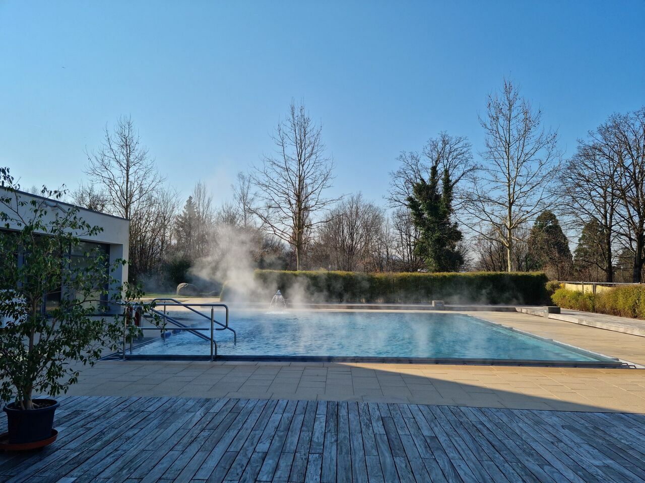 aktuelle Wassertemperatur: ca. 31,4°C - Vier-Jahreszeiten-Becken - ganzjähriges warmes Außenbecken mit Sprudelliegen